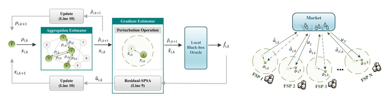 1、非合作博弈广义纳什均衡的分布式计算以及在线学习:针对随机聚合博弈中智能体仅可使用邻居信息和带噪声的梯度信息的场景,结合镜像梯度法与动态平均跟踪设计了新型的分布式学习算法,实现动态重复博弈的次线性无悔均衡策略学习,并给出了变分遗憾界定量分析。针对具有损失bandit反馈的非合作博弈纳什均衡求解问题,提出了异步在线学习策略,自适应调整下一步行动以最小化长期遗憾损失。针对管理集成可再生能源发电、能源转换和能源交易的能源互联网系统,提出了一个网络化的 Stackelberg 博弈框架, 使得公司在做出决策时会考虑与其他公司的战略互动,同时考虑被动消费者在点对点约束条件下的最佳反应,结果证明了系统的运营效率和战略稳定性,强调了积极参与市场对能源公司和消费者的优势。